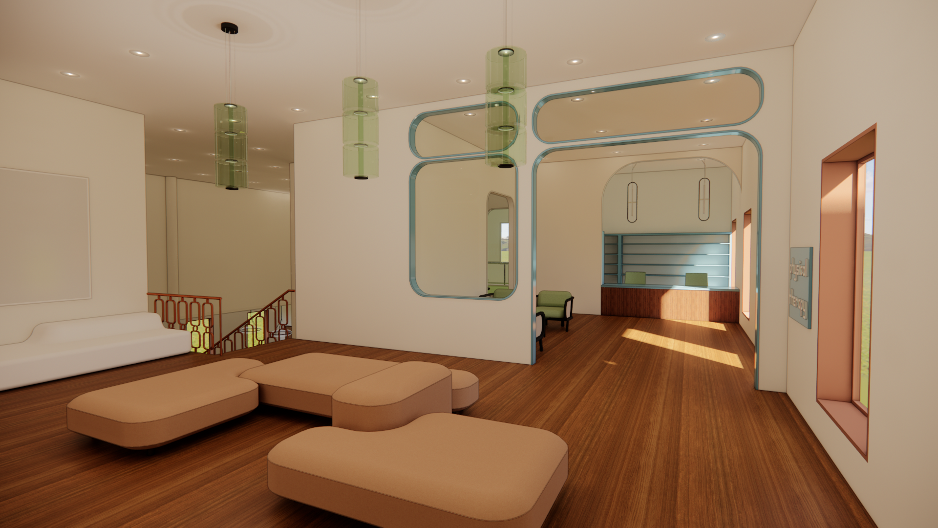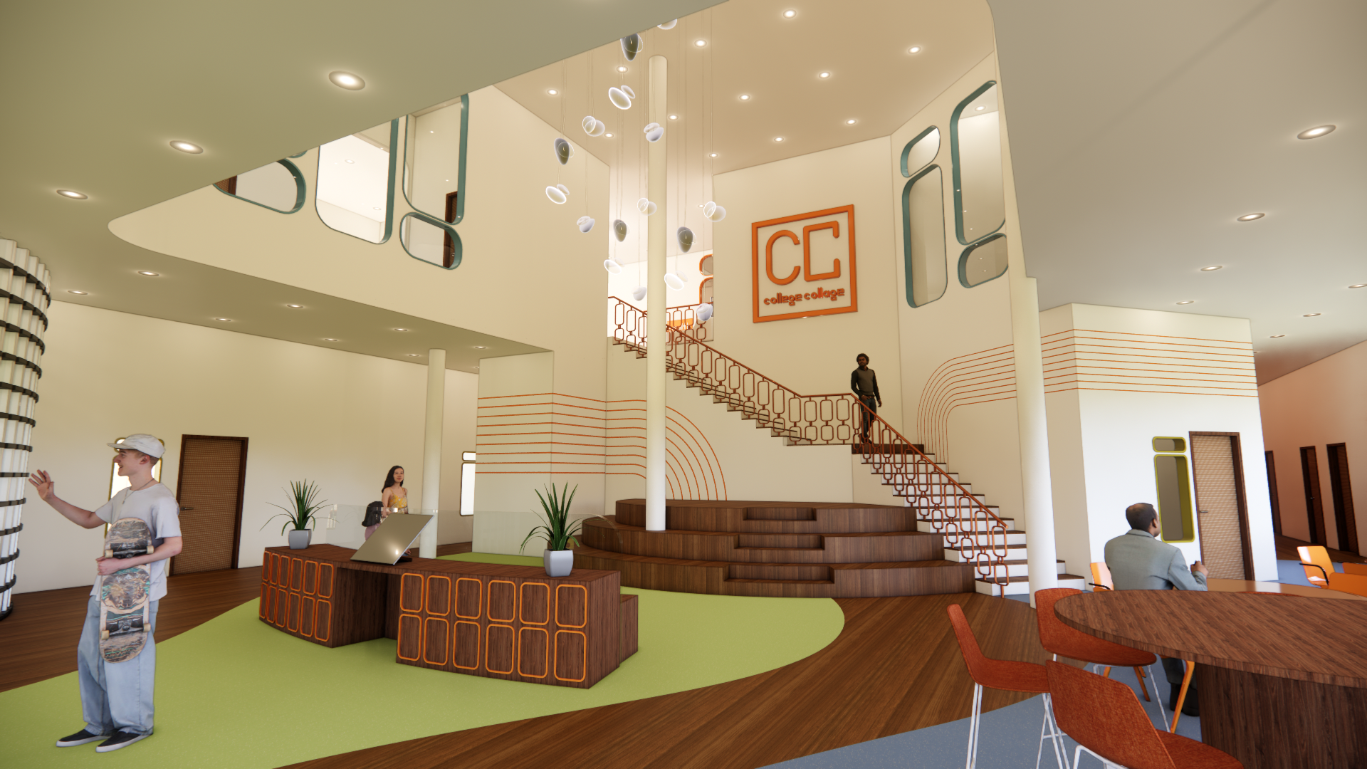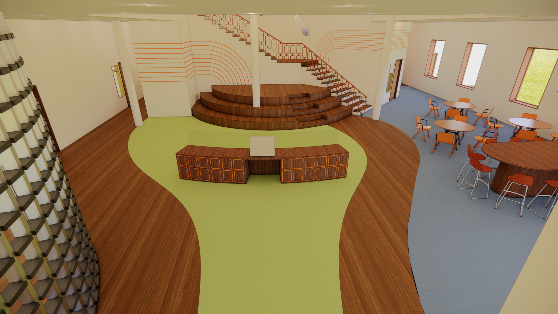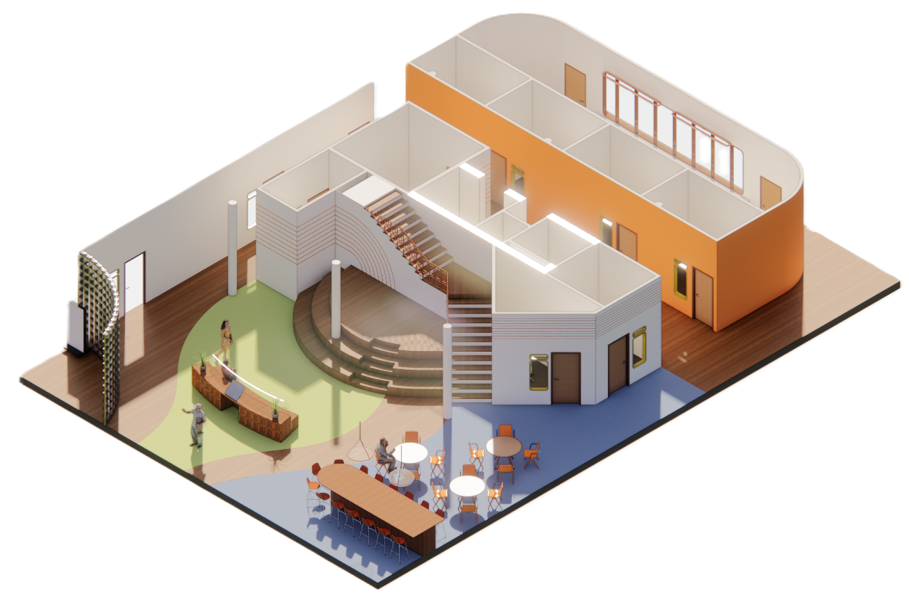 In order to create a space that feels welcoming and community centered, the design of the center will take inspiration from “arcs and tangents”. The softer curved lines will create appealing features that the eye will be attracted to, while the linear straight lines keep the space structured. Curved lines deter emotions of fear and discomfort, and will allow users to feel more welcome. Soft but bright hues of orange create energetic and social tones, while blue and green compliment the wood tones and keep the space grounded.