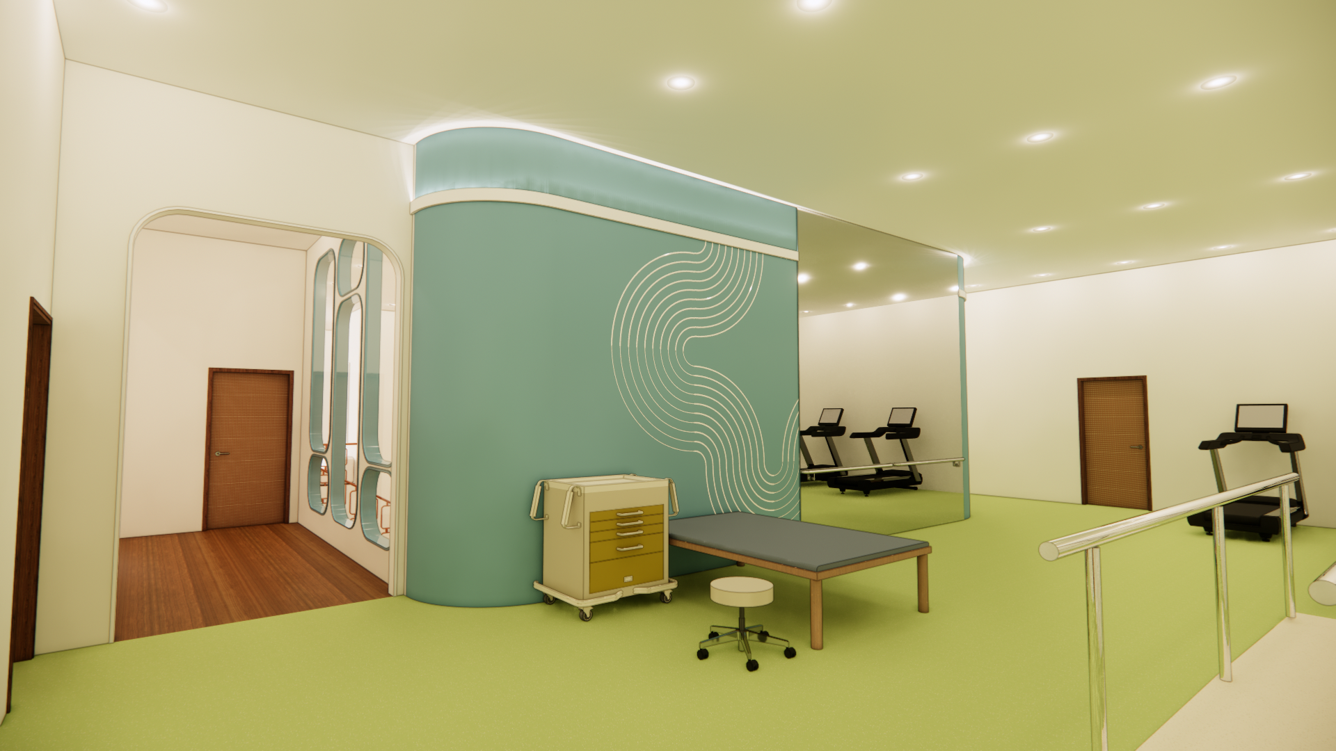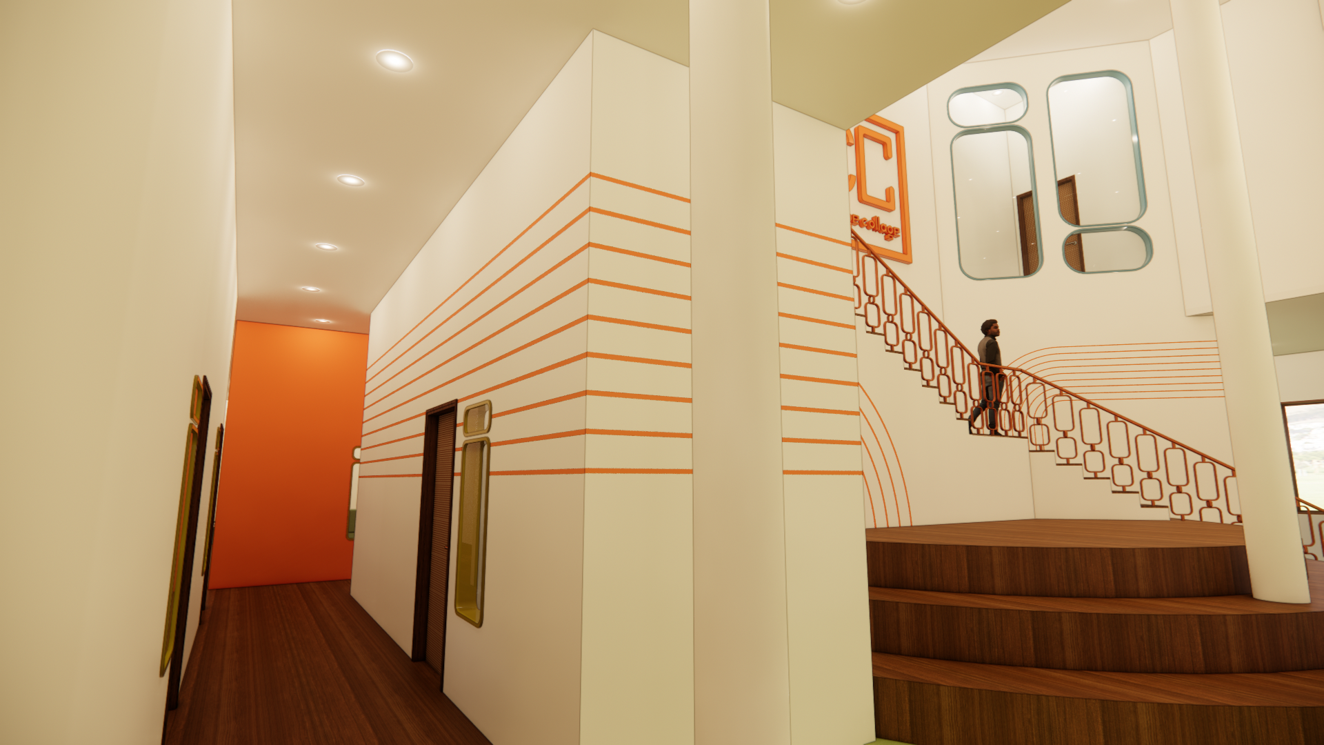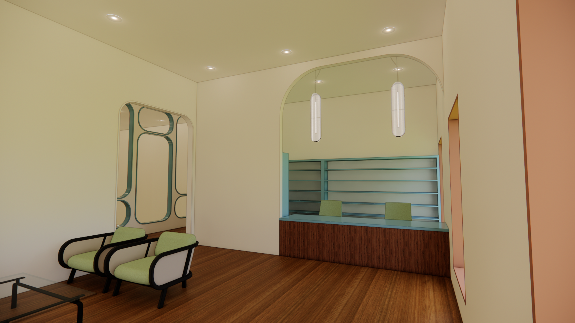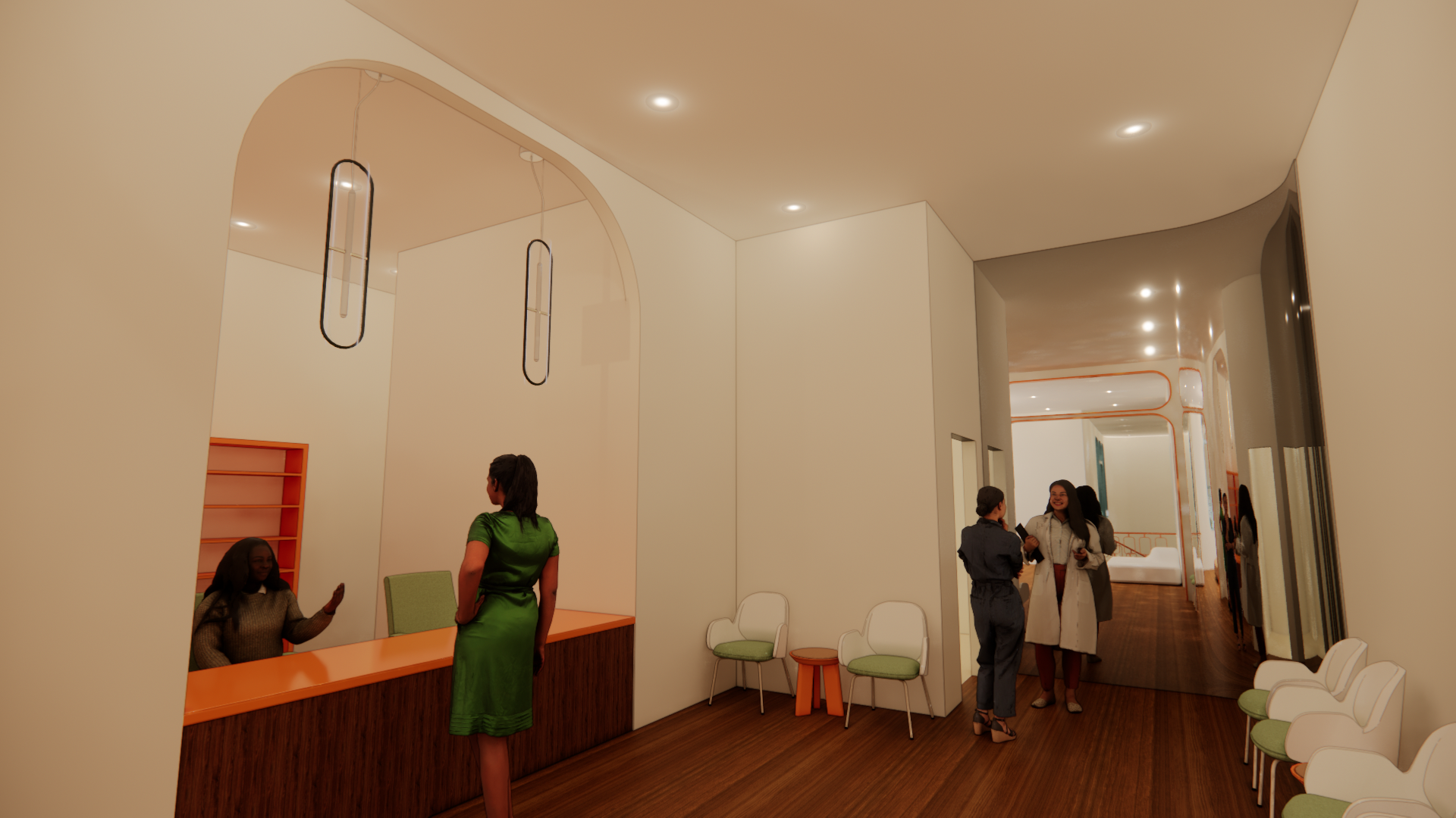 In order to create a space that feels welcoming and community centered, the design of the center will take inspiration from “arcs and tangents”. The softer curved lines will create appealing features that the eye will be attracted to, while the linear straight lines keep the space structured. Curved lines deter emotions of fear and discomfort, and will allow users to feel more welcome. Soft but bright hues of orange create energetic and social tones, while blue and green compliment the wood tones and keep the space grounded.