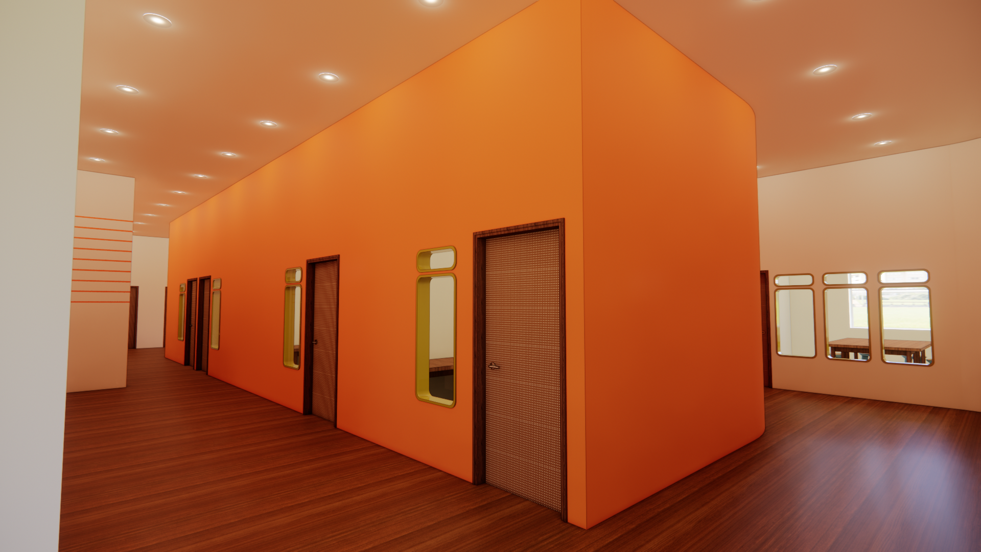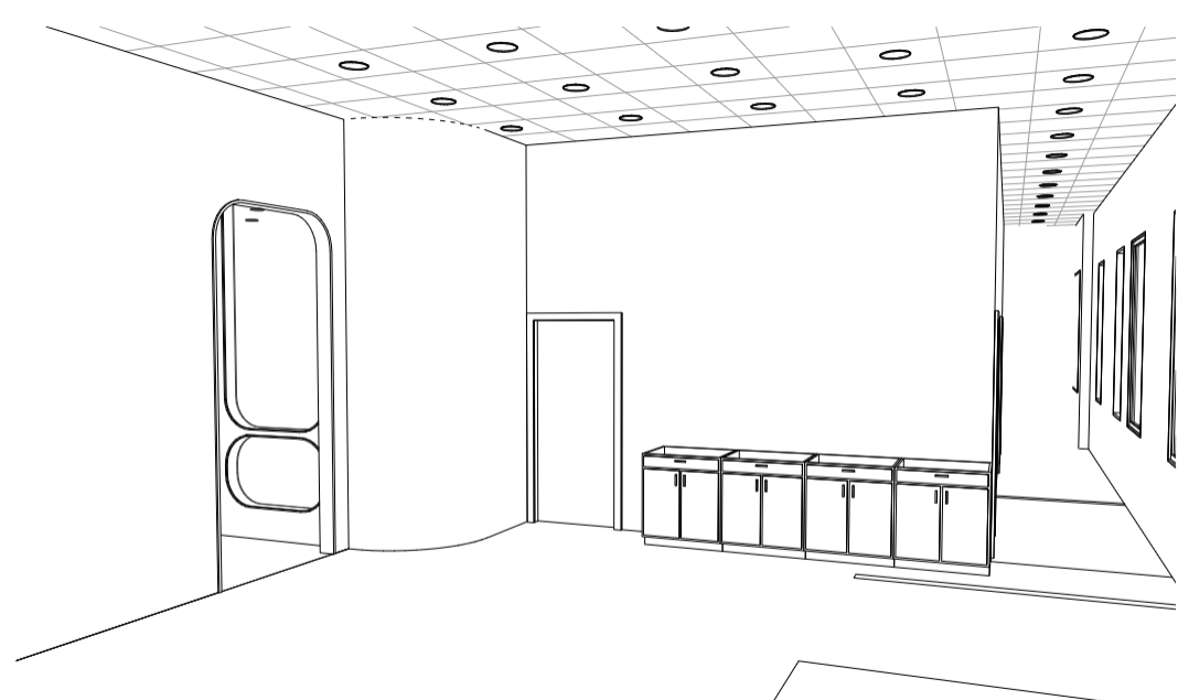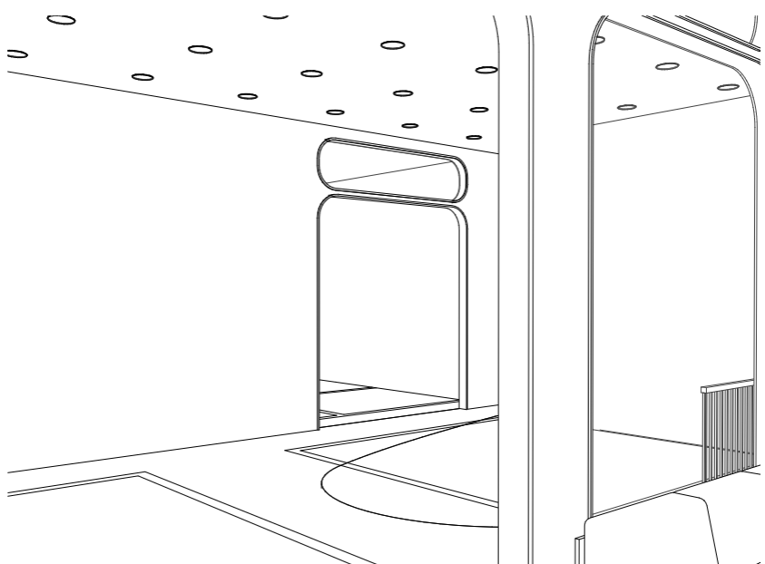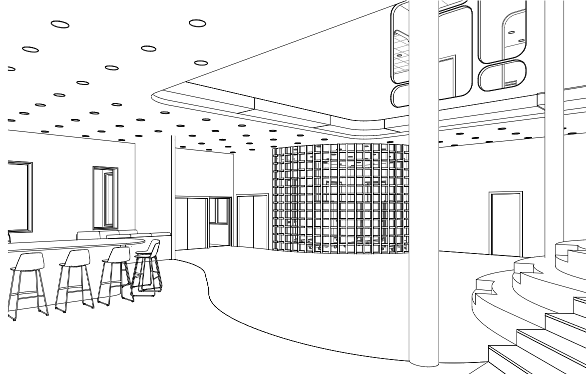A curvilinear version of the parti has been transformed into various windows and openings. The size of the custom portal directly translated to the size/importance of the space it is attached to.